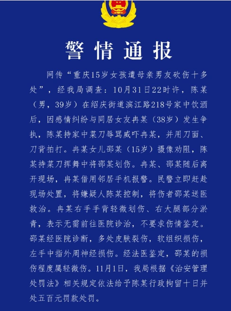 那是一个平凡的夜晚,重庆彭水县绍庆街道的灯光在夜色中闪烁,但对于冉某一家来说,却是一个不平凡的夜晚。10月31日22时许,39岁的陈某,一位本该给予温暖与依靠的伴侣,却在酒精的作用下,与同居女友冉某因感情纠葛陷入了激烈的争执。愤怒的火苗在陈某心中熊熊燃烧,他一把抓起厨房里的菜刀,对着冉某咆哮、辱骂,甚至用刀面和刀背狠狠地拍打她的身体。而这一切的目睹者,是冉某年仅15岁的女儿邵某。她惊恐万分,却试图用手机记录下这恐怖的一幕,希望能用这种方式劝阻陈某的疯狂行为。然而,悲剧还是发生了。在陈某挥舞菜刀的瞬间,邵某细嫩的手臂上被划开了一道深深的口子,鲜血瞬间染红了她的衣袖。