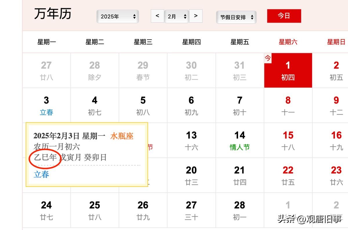 不信看看日历上,正月初五还是甲辰年,从立春、正月初六开始,才是乙巳年。严格来说,是从这一秒开始,斗指寅位,太阳黄经到达315度,“一岁”的时光就开始了,属相的切换也从这一刻开始。