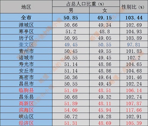 潍坊市各区县市人口性别比例情况