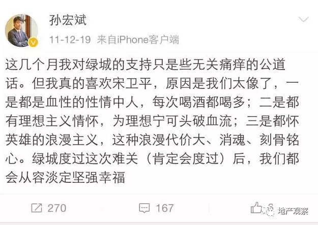 第二天,孙宏斌跑到无锡买了一套绿城香樟园的房子,并在微博上公开表示支持绿城。