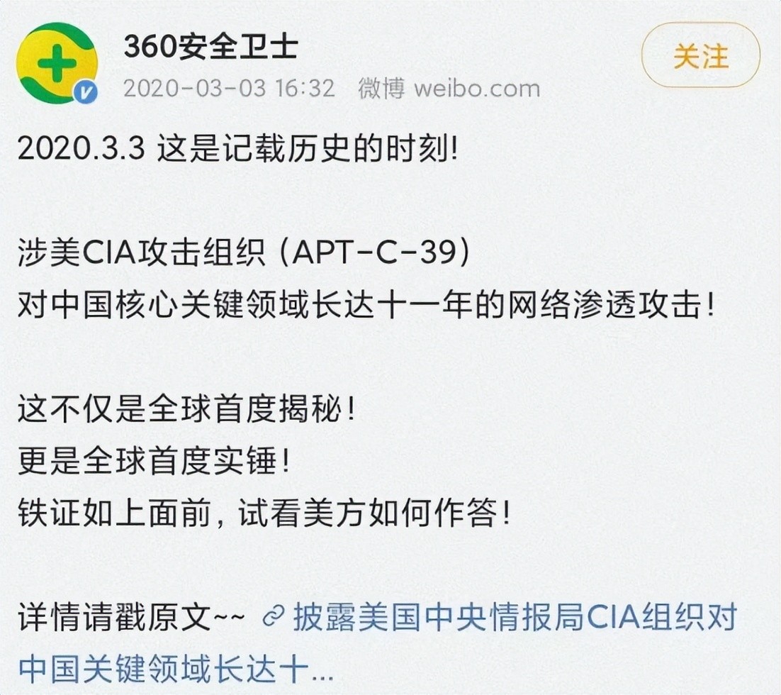 2020年3月3日,360安全卫士官方微博发布了一条博文,首次证实了涉美CIA攻击组织(APT-C-39)对中国核心关键领域长达十一年的网络渗透攻击。