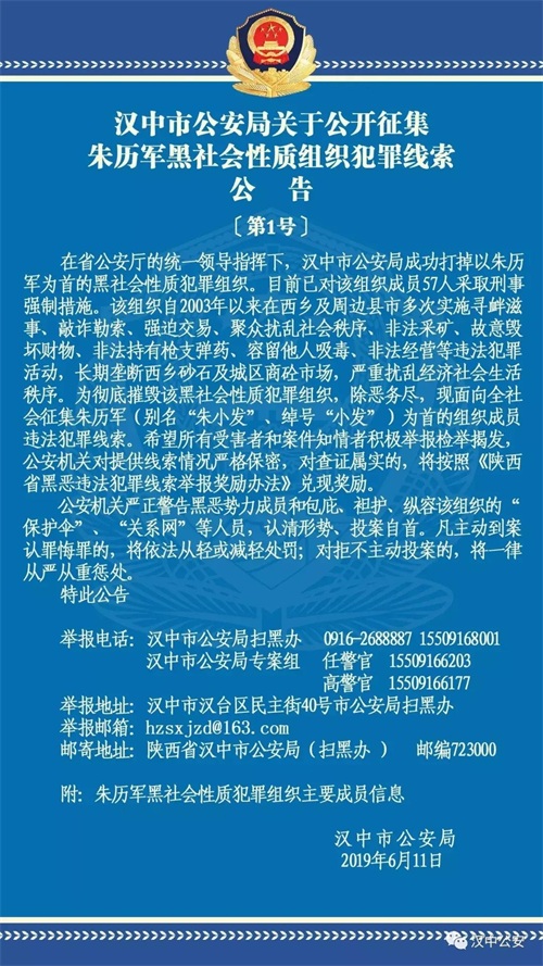 汉中市公安局关于公开征集朱历军黑社会性质组织犯罪线索公告
