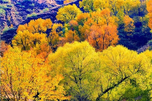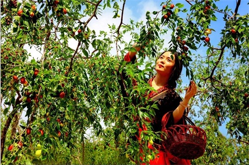 第二,色彩丰富而典雅。自然界和人类社会五彩缤纷,充满了无限丰富和不断变化的色彩。不同的色彩能给人以心理上不同的感受,激发人们的情感共鸣。如暖色给人以温暖、温馨的感觉,冷色使人产生理智、宁静的联想等等。马夫先生特别善于运用色彩来表达他的光影理念,如捕捉橙黄色的晚霞云彩和晚霞辉映下的橙黄色水面,表现黄土高原段的黄河;聚焦满地金黄的柿树落叶和一片橙红的树上红叶,展现丰收的金秋时节;特写青翠嫩绿的初春枣叶,讲述枣乡春天的故事;运用蓝绿相邻色,表现冬天的茫茫原野营造出北国冬季的安静平和等等。他还特别重视运用互补色的对比突出作品主题。如在府谷丹霞的拍摄中,大量运用近景丹霞的橙红色与远景群山的冷蓝色,形成冷暖色彩的对比,使画面更具视觉冲击力和美感。此外,他尤其重视同一幅画面各种色彩的协调和平衡。如表现“红碱淖”美丽风光的全景式图片,蓝天白云下,一望无际的金黄沙海里嵌入一位红裙飘飘的美丽少女,冷暖色彩相互平衡,给观者带来温暖和愉悦的快感,使画面呈现出一种神圣与美丽。