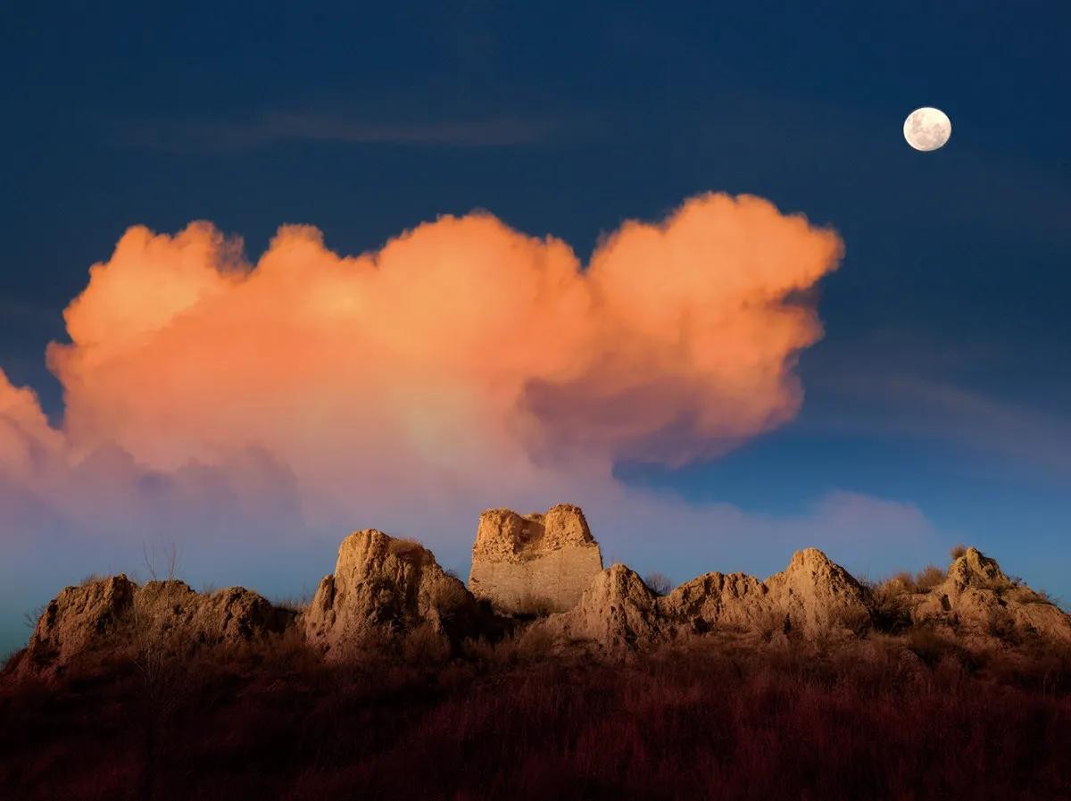 第三,层次清晰而富有质感。现实世界是三维立体的,而照片则是二维平面的。如何在二维平面上表现出三维立体的空间感和丰富层次,是马夫摄影非常注重的一个关键环节。一是借助拍摄对象近大远小的透视变化进行创作。如拍摄神木老城的街巷,他巧妙地运用道路的纵深感引导观者的视角由近及远,使照片的层次感突显出来。特殊情况下,他还会利用景物本身有规律的线条形成透视,使画面表现出三维空间效果。二是拍摄时充分利用前景。如景陵平视图的创作,就是将陵前石雕作为前景,景陵所在的群山变为中景,天边的云彩和万里晴空成为远景,画面视线向前延伸,立体空间氛围增强,层次变得非常丰富。三是选择明暗对比较大的区域作为拍摄背景,而将拍摄对象安排在明暗交界区域,强烈的画面明暗反差,由近及远递进的明暗关系,使观者产生非凡的空间立体体验。四是巧用色彩。将颜色差别明显的景物同时纳入画面,利用强烈的对比效果,增强照片的层次感,展示丰富的画面内容。《丹霞丹青》的拍摄大量地运用了这种方法。此外,调整曝光组合、巧妙选取角度、加强虚实对比、使用浅景深等等,都是他熟练运用的方法。