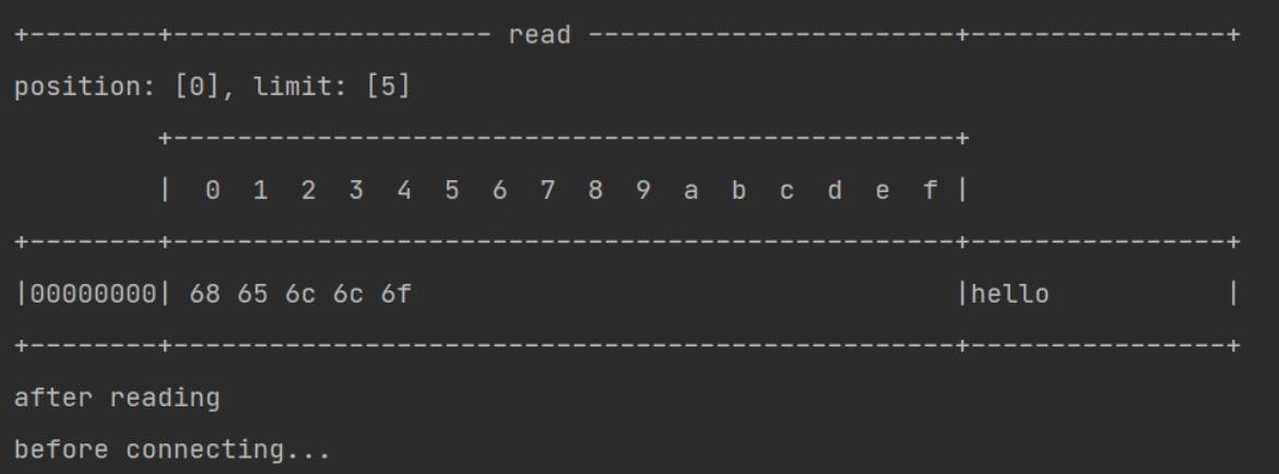 ByteBuffer buffer = ByteBuffer.allocate(4);// 解码并打印System.out.println(StandardCharsets.UTF_8.decode(buffer));你这是因为 UTF-8 字符集下,1 个汉字占用 3 个字节,此时缓冲区大小为 4 个字节,一次读时间无法处理完通道中的所有数据,所以一共会触发两次读事件。这就导致 你好 的 好 字被拆分为了前半部分和后半部分发送,解码时就会出现问题