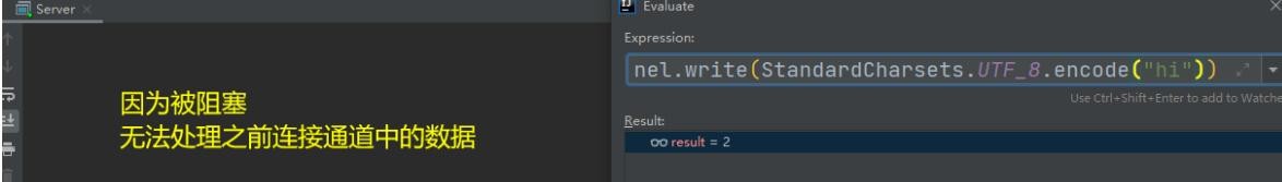 之前的客户端再次发送消息,服务器端因为被 accept 阻塞,无法处理之前客户端发送到通道中的信息
