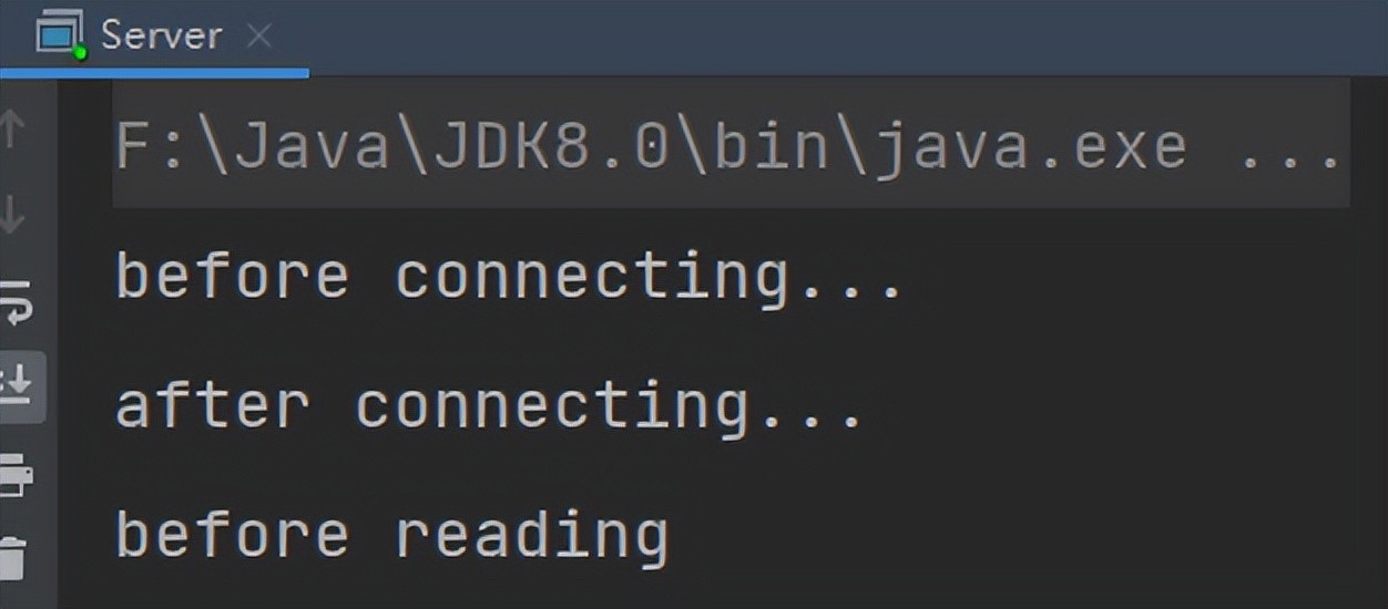 public class Client {public static void main(String[] args) {try (SocketChannel socketChannel = SocketChannel.open()) {// 建立连接socketChannel.connect(new InetSocketAddress("localhost", 8080));System.out.println("waiting...");} catch (IOException e) {e.printStackTrace();}}}运行结果