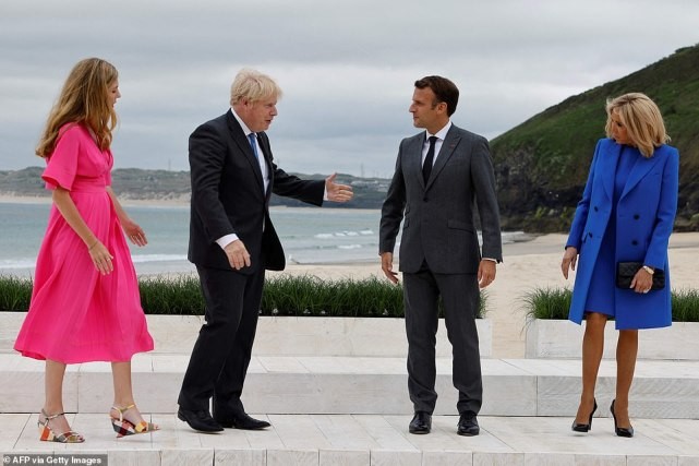 当地时间6月11日,法国第一夫人布里吉特·马克龙陪同丈夫出现在康沃尔郡,参加在那里举行的G7峰会。尽管68岁的前女教师已经多次和丈夫一起见过英国首相鲍里斯·约翰逊,不过和首相夫人-33岁的凯莉正式见面还是头一回。