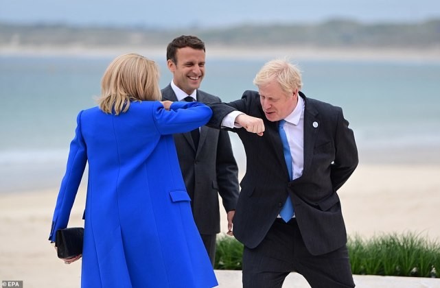 布里吉特和英国首相,用碰肘的方式打了招呼,画面很是有趣,43岁的马克龙也情不自禁地大笑起来。
