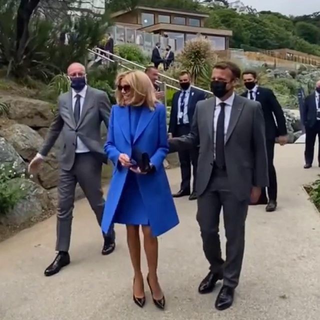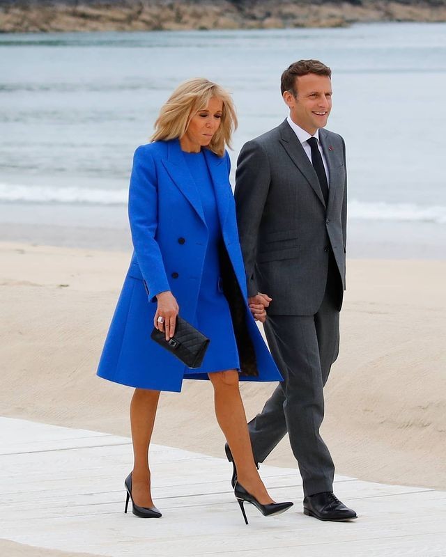 68岁马克龙夫人亮相G7,宝蓝裙全场最短,被43岁丈夫小心呵护