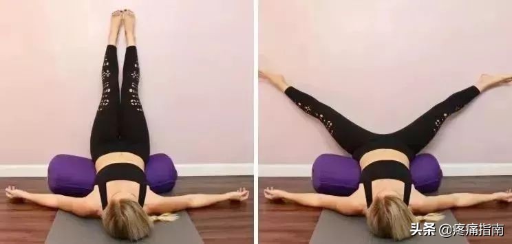 仰卧,下背部放抱枕上双腿并拢伸直靠墙/双腿伸直靠墙并打开沉向地面手臂放于体侧、掌心朝上闭眼调息,保持2-3分钟