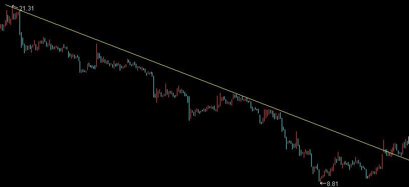 那么趋势线的画法是怎样来确定的呢?按照数学定理:两点之间可以决定一条直线,而且是一条唯一的直线。而股价的线路图是由长累月的交易记录所形成的。因此,我们在画趋势线时,必须要选择两个最具有决定性的点(最具有意义的两个高点或者最低点),,开始回升,随后出现下跌,但没有再跌破前一个低点,然后再度迅速上升。连接这两个低点的直线,就是上升趋势线。决定下跌趋势也需要两个以上的反转顶点,也就是上升到某个顶点,开始下跌,随后出现反弹,但没有再突破前一个高点,然后再度迅速下跌。连接这两个顶点的直线,就是下降趋势线。我们还可以进一步地概括为:原始上升趋势线包括几段上升行情,可以明显地看出每段中级行情的低点都比前几段行情的低点有所抬高。因此,连接这两个最先形成的中级行情的低点,或者说最具有意义的两个中级行情低点的边线,就形成了上升行情的原始趋势线。同样地,中级行情也包括几小行情,将最先发生两段小行情的低点连接起来便形成了中级趋势线。