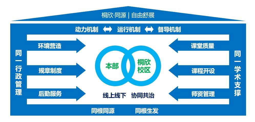 本部与桐欣校区共生于同一个制度体系,同一个行政管理团队和同一个教育教学模式在一起互相作用、互相影响、互相配合,从而链接好学校、家庭、社会,构建出智能生态的育人体系。