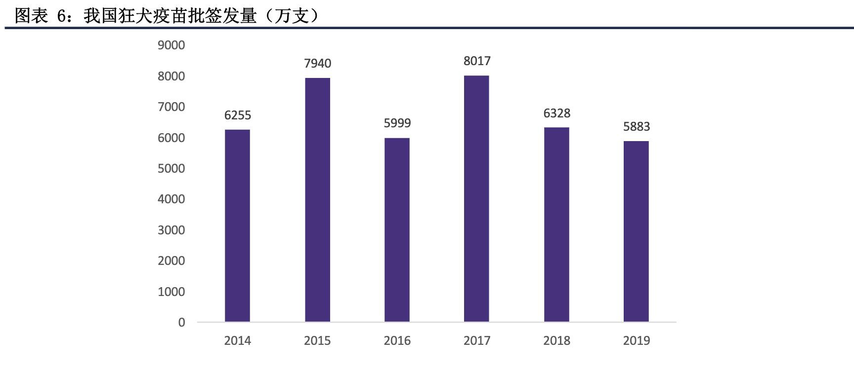 狂犬病是由狂犬病毒引起的一种人畜共患急性传染病,病死率接近100%。我国是狂犬病高发国家之一,接种狂犬疫苗是预防和控制狂犬病的唯一有效方法。近年来,我国狂犬疫苗的批签发量在6000-8000万支。随着宠物市场的不断扩大,患病人数有增加趋势,狂犬疫苗的整体需求预计保持稳中有升。