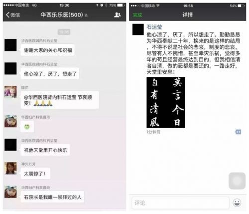 昨日石应康的女儿、华西医院肾内科副教授石运莹在微信朋友圈写道:“他心凉了,厌了,所以想走了。勤勤恳恳为华西奉献二十年,换来的是这样的结局,不得不说是社会的悲哀,制度的悲哀。