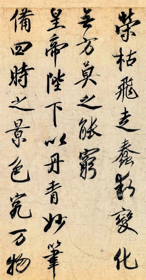 蔡京跋《赵佶雪江归棹图卷》 北京故宫博物院藏释文:臣伏观御制雪江归棹。水远无波,天长一色。群山皎洁,行客萧索。鼓棹中流,片帆天边,雪江归棹之意尽矣。天地四时之气,不同万物生天地间。随气所运,炎凉晦明,生息荣枯,飞走蠢动,变化无方。莫之能穷。