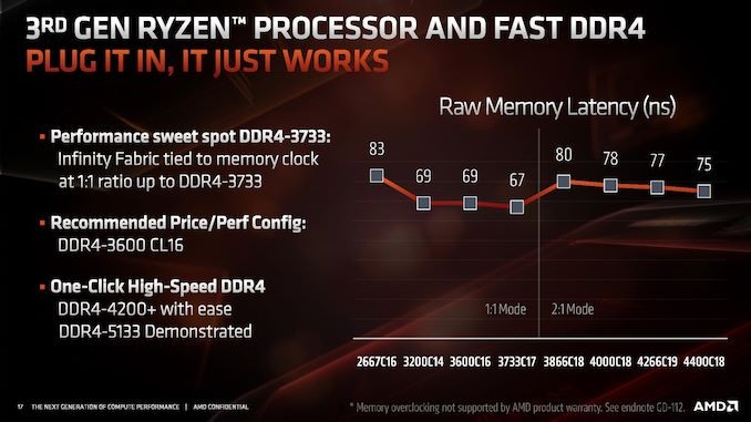 那么为什么内存超过3733MHz的体验反而变差了呢?这是因为Zen 2架构改进了内存控制器,加入了IF总线与内存的分频机制,当内存频率超过3733MHz时(以AMD PPT为例,实际中有差异),系统就会自动切换到2:1分频模式,这样子内存频率不会受IF总线限制,可以获得更高的内存带宽,但是采用2:1分频会带来内存延时增加的问题。