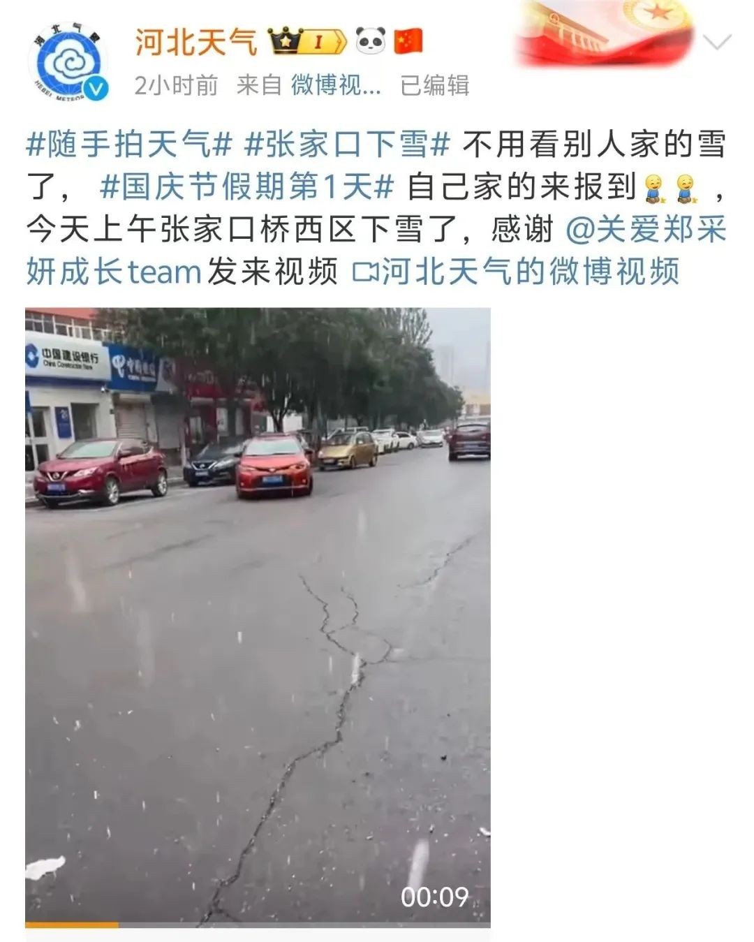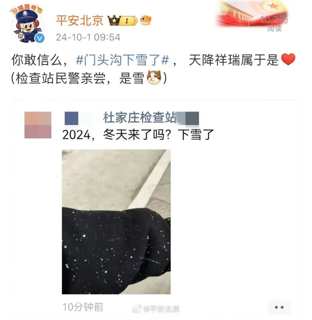 10月1日9时54分,@平安北京 发布微博:你敢信么?北京门头沟下雪了,天降祥瑞属于是