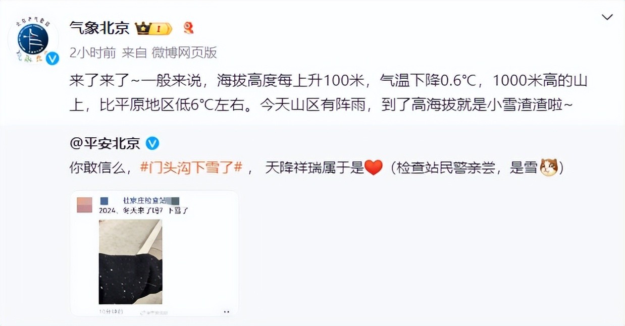 1日下午,@气象北京 转发这条微博并解释道:一般来说,海拔高度每上升100米,气温下降0.6℃,1000米高的山上,比平原地区低6℃左右。今天山区有阵雨,到了高海拔就是小雪渣渣啦~