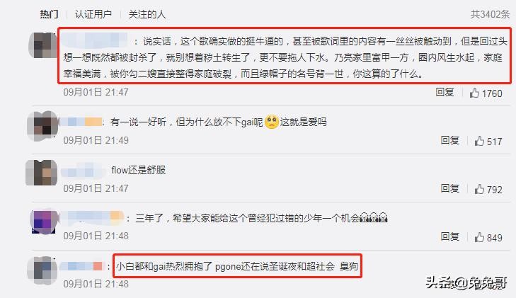 “睡了嫂子还好意思diss别人好男人人设呵呵”“这是看双冠军的另一位现在混得风生水起,赚着他再也赚不到的钱心里开始发酸了吧”“歌写得挺好的,但是小三就是小三,毁了人家的家庭认错了又有什么用呢?”