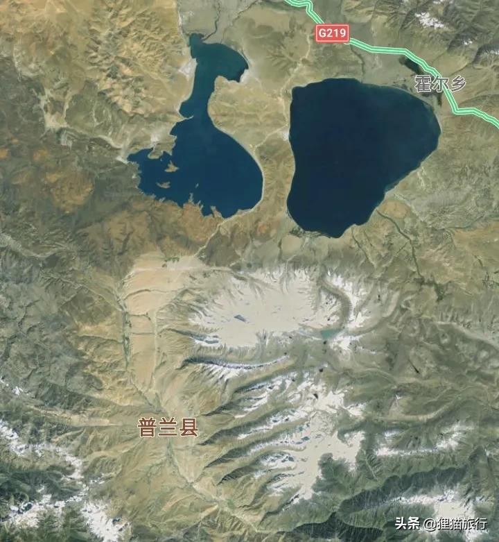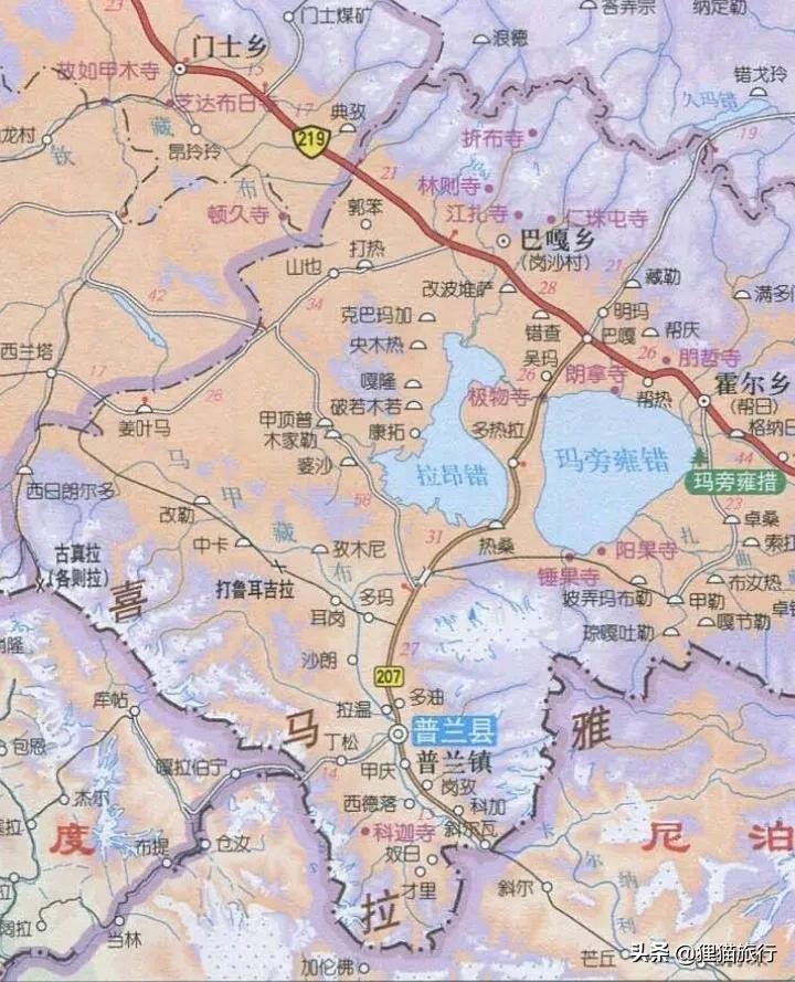 普兰县城不大,建设得挺漂亮,这里的交通主要就是新藏公路219国道,以及通往普兰县城的207省道。在219国道与207省道的丁字路口有两个大湖泊,西边的是拉昂错,东边更大一点的是玛旁雍错,这两个湖泊都在普兰县城北边,在游客必经之路上。