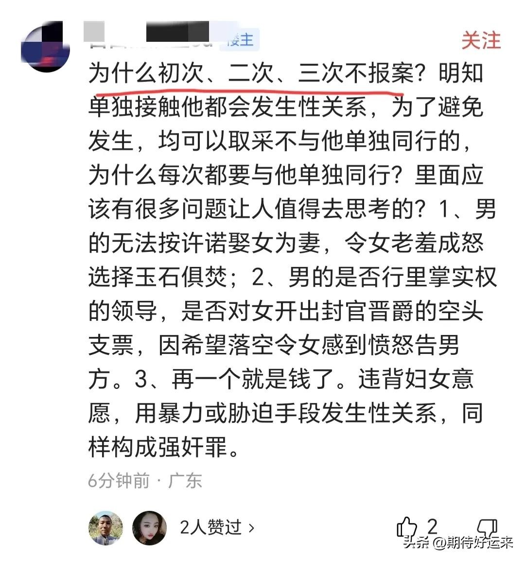 有网友好奇,为什么初次、二次、三次不报案?为什么明知道会发生性关系,还要与他单独同行?该网友还大胆假设了三点。