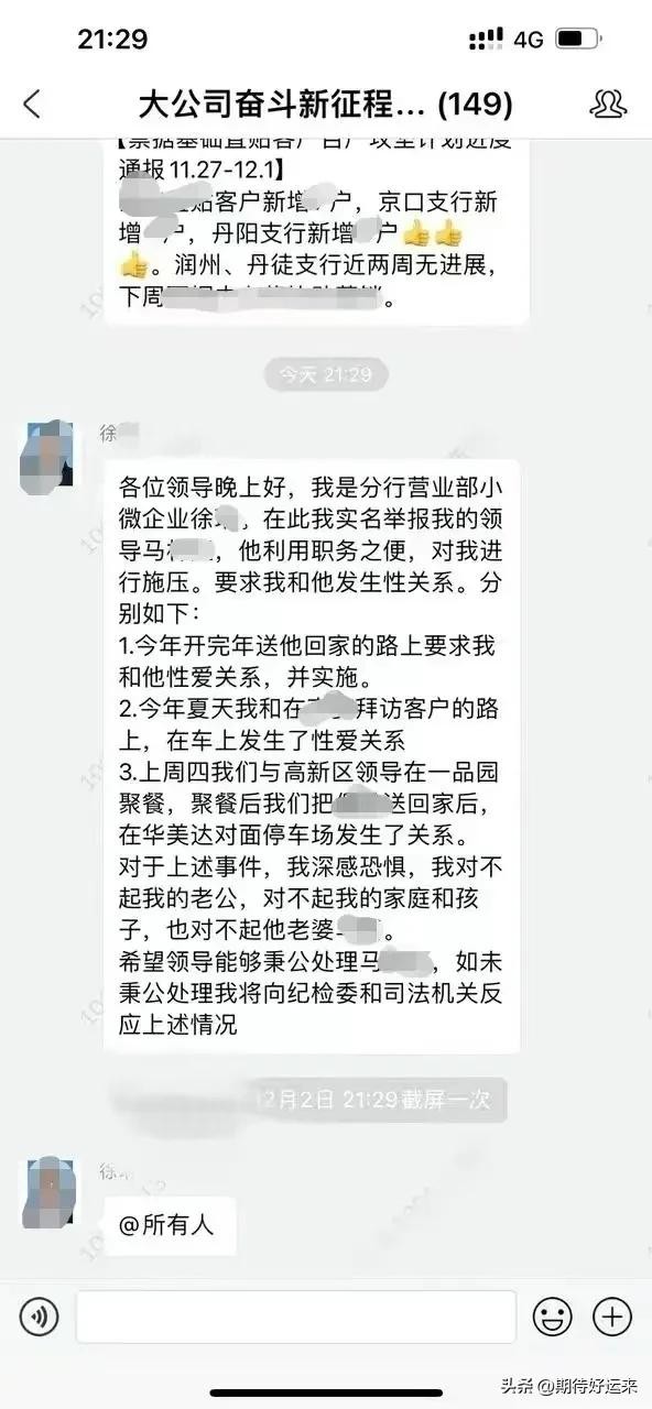 12月5号,一则江苏某银行员工实名举报被领导施压发生性关系的消息冲上了热搜。据网上爆料的一个聊天记录截图内容显示,一位自称是分行营业部的员工,在149人的大群中描述,被领导利用职务之便进行了三次性侵的细节。