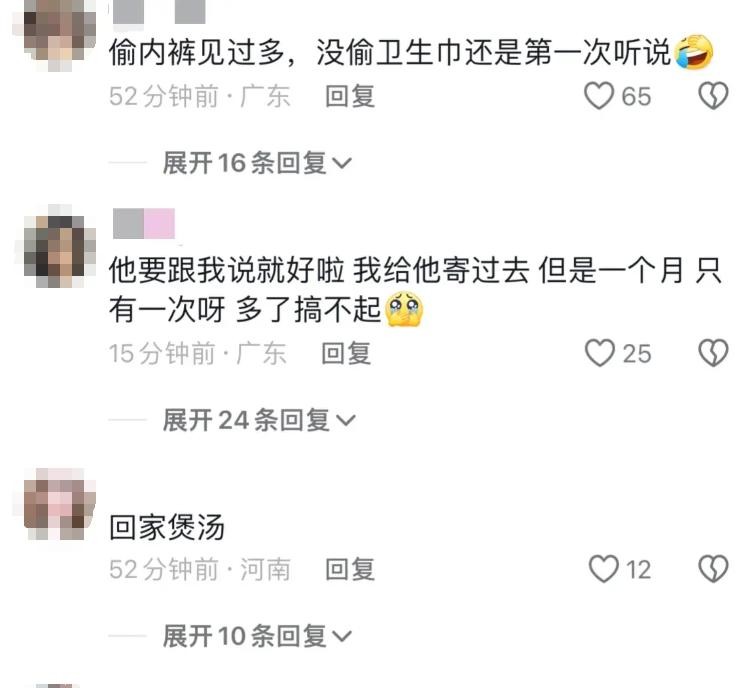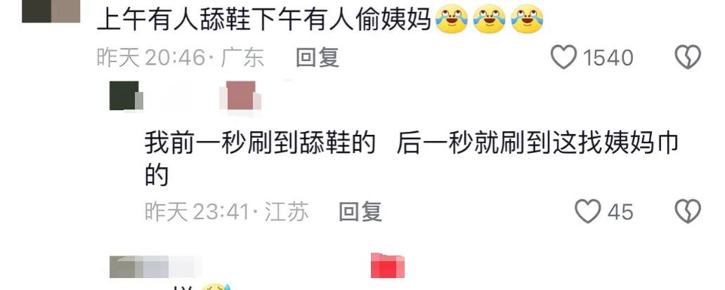 这位网友目瞪口呆地看着大叔消失在视线中,心想"这世界真是太疯狂了!上午还有人舔鞋,下午就有人偷卫生巾,这是要闹哪样啊?"