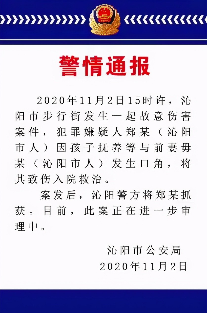 11月2日15时许,沁阳市步行街发生一起故意伤害案件,犯罪嫌疑人郑某(沁阳市人)因孩子抚养等与前妻毋某(沁阳市人)发生口角,将其致伤入院救治。案发后,沁阳警方将郑某抓获归案。目前,此案正在进一步审理中。